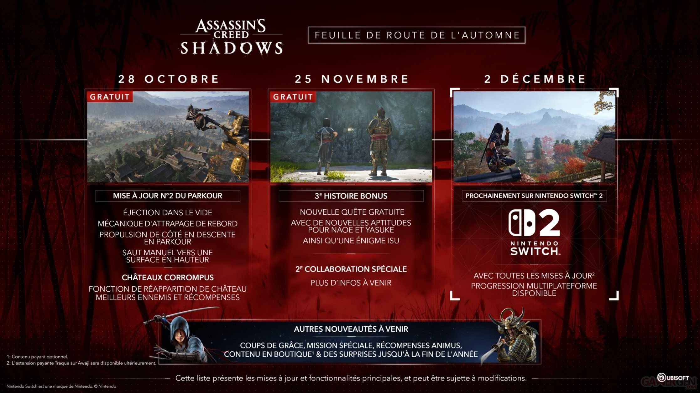 La nouvelle est tombée en parallèle de la révélation de la feuille de route du contenu post-lancement pour l'automne 2025. En effet, à la fin de la vidéo dédiée à cette roadmap, le directeur associé Simon Lemay-Comtois et son équipe nous ont une fois de plus bien fait rire tout en donnant quelques détails additionnels au sujet de ce portage. Sur Switch 2, Assassin's Creed Shadows sortira avec l'ensemble des mises à jour et contenus gratuits déjà disponibles sur PS5, Xbox Series X|S, PC et dans le cloud.