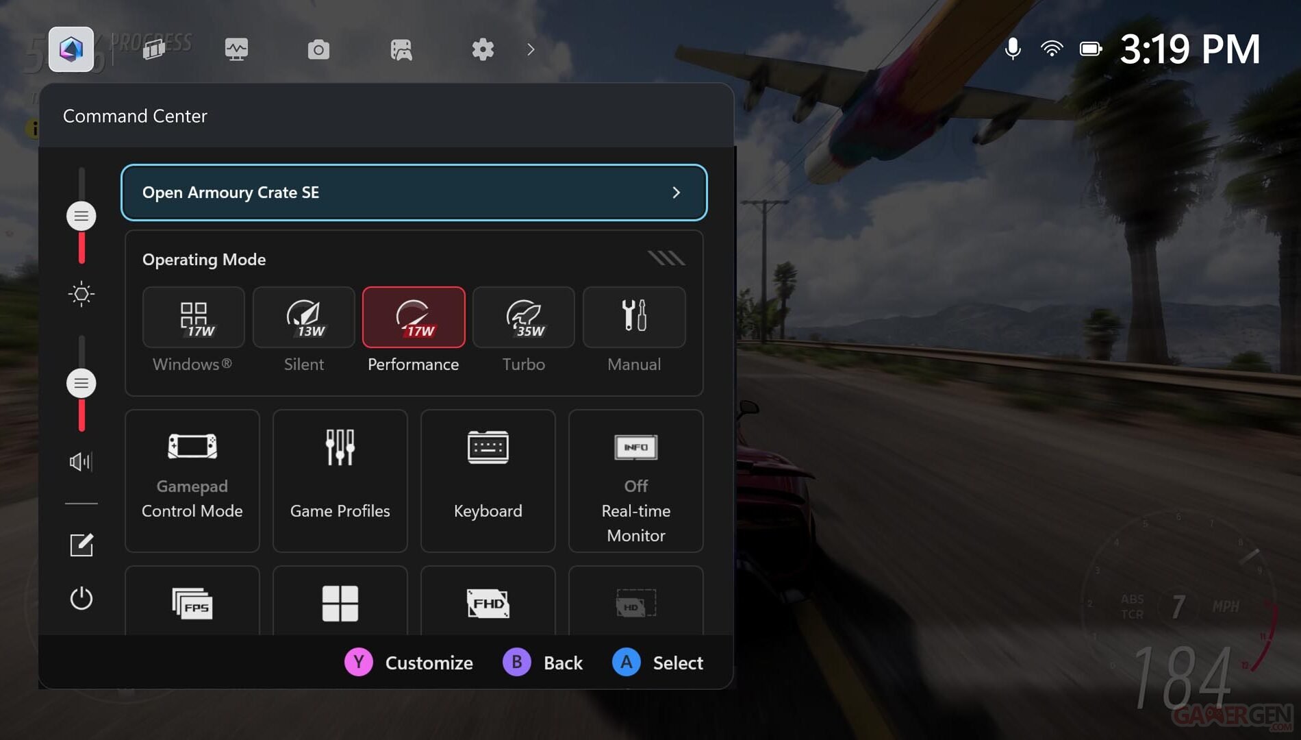 Personnalisez les anneaux lumineux des joysticks : Les anneaux lumineux colorés autour des sticks analogiques font partie des éléments visuels emblématiques de la Xbox Ally, mais vous pouvez souhaiter les atténuer pour un vol de nuit ou une session dans une pièce sombre. Pour les ajuster, ouvrez Armoury Crate SE, puis sélectionnez Éclairage pour modifier leur intensité ou leur pulsation, ou les désactiver entièrement.