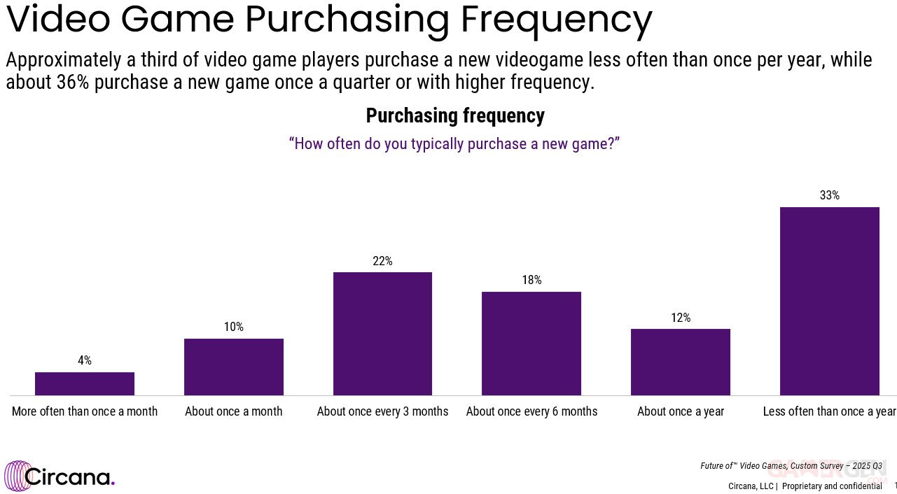 Mat Piscatella de Circana a dévoilé une récente étude, qui se concentre sur les habitudes de consommation des joueurs et joueuses aux États-Unis. Le résultat est édifiant : les joueurs n'achètent plus de jeux vidéo. Selon l'étude, 33 % des Américains achètent moins d'un jeu par an ! En visant plus large, 63 % des Américains achètent deux jeux vidéo ou moins par an. 22 % des joueurs achètent quatre jeux par an et ils ne sont que 4 % à acheter plus d'un jeu vidéo par mois, soit plus de 12 par an.
