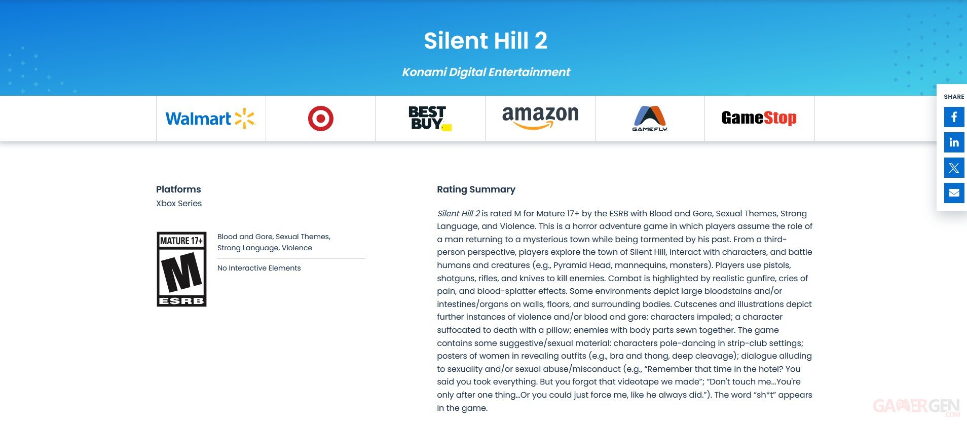 Les rumeurs vont bon train et, il y a quelques semaines, les internautes ont découvert deux emplacements vides sur le site officiel de Silent Hill 2 Remake, suggérant l'arrivée du jeu sur d'autres consoles. Konami et Bloober Team n'ont toujours rien officialisé. Désormais, c'est l'ESRB qui vient de lister Silent Hill 2 sur Xbox Series X|S dans sa base de données. Sans surprise, le jeu écope d'une classification Mature 17+, comme sur PC et PS5.
